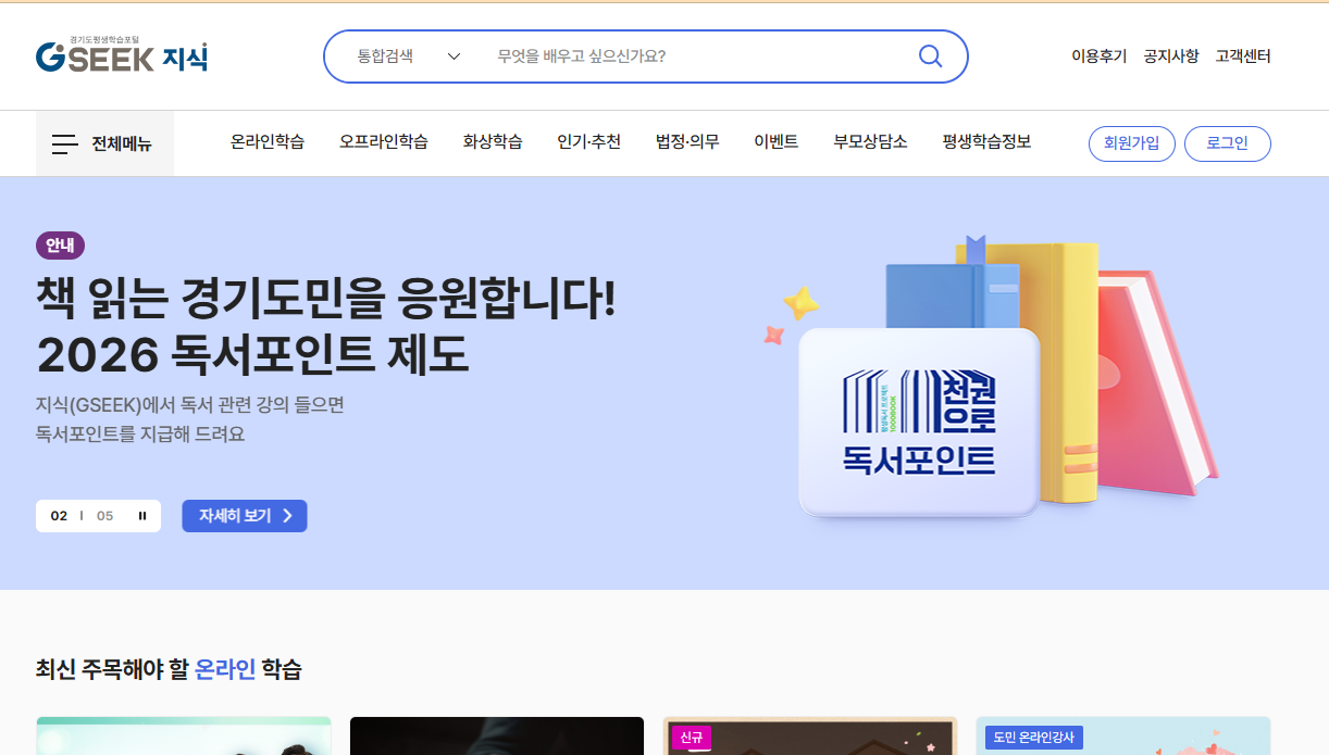 경기도 평생학습포털 지식(GSEEK)은 경기도와 31개 시·군이 함께 운영하는 온라인 평생교육 플랫폼입니다. 유아부터 어르신까지 누구나 언제 어디서나 무료로 이용할 수 있으며, 365일 24시간 학습이 가능한 것이 가장 큰 특징입니다.